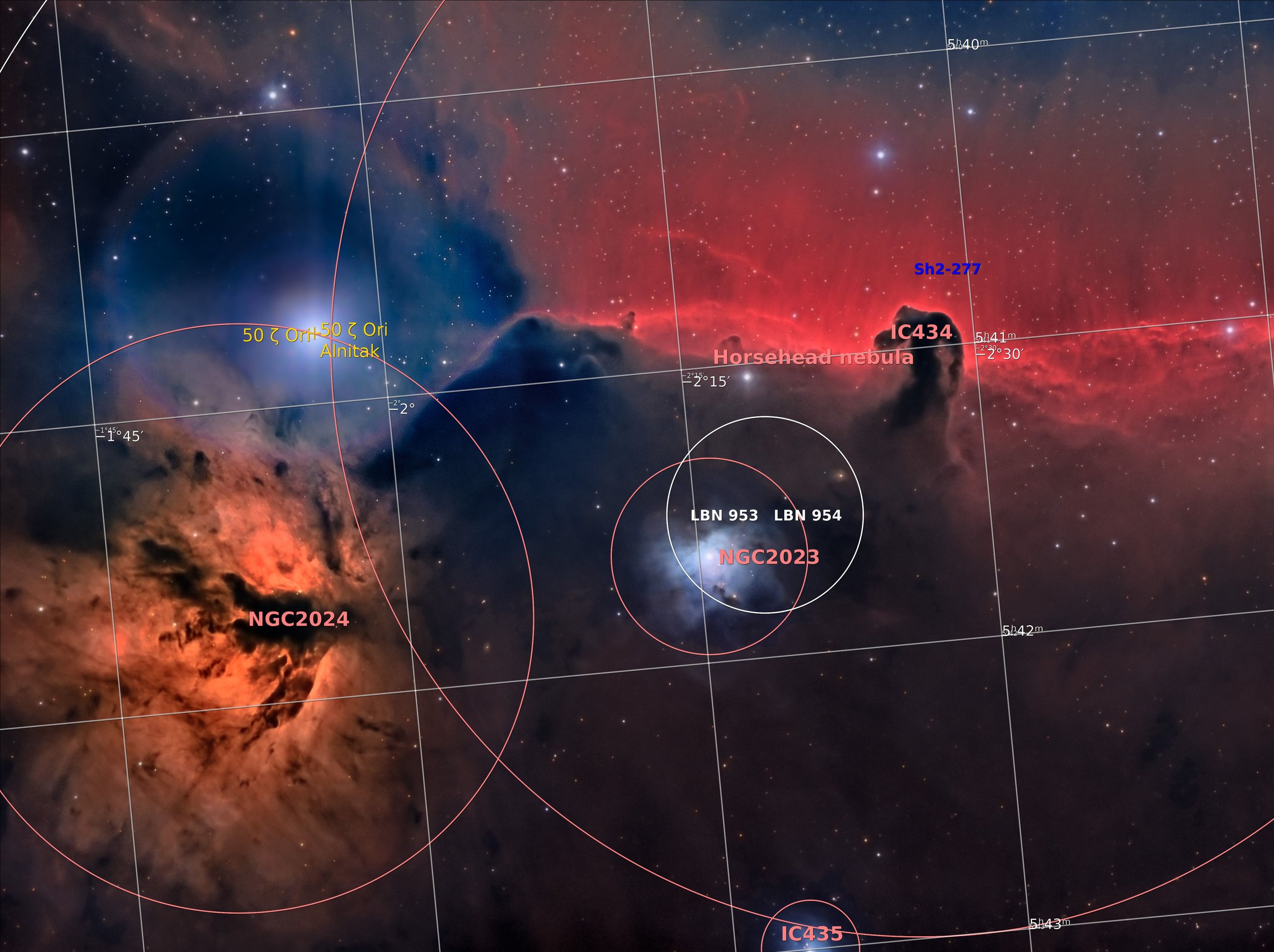 Megfigyelése elég nehéz, minimális fényszennyezettség mellett egy legalább 15–20 cm-es távcsőre van szükségünk. Alatatta az NGC 2023 kék színű, balra a nagyobb NGC 2024 vörös színű csillagköd található. Az NGC 2024 felett az Alnitak, az NGC 2023 alatt az IC 435 (kék) található. A Lófej-köd mögött elnyúló, hosszú, vörös sáv az SH2-277. Az SH2-277 és az NGC 2024 ködöket Láng-ködnek (Flame Nebula) hívjuk. Az elhelyezkedésükről itt egy infografika.